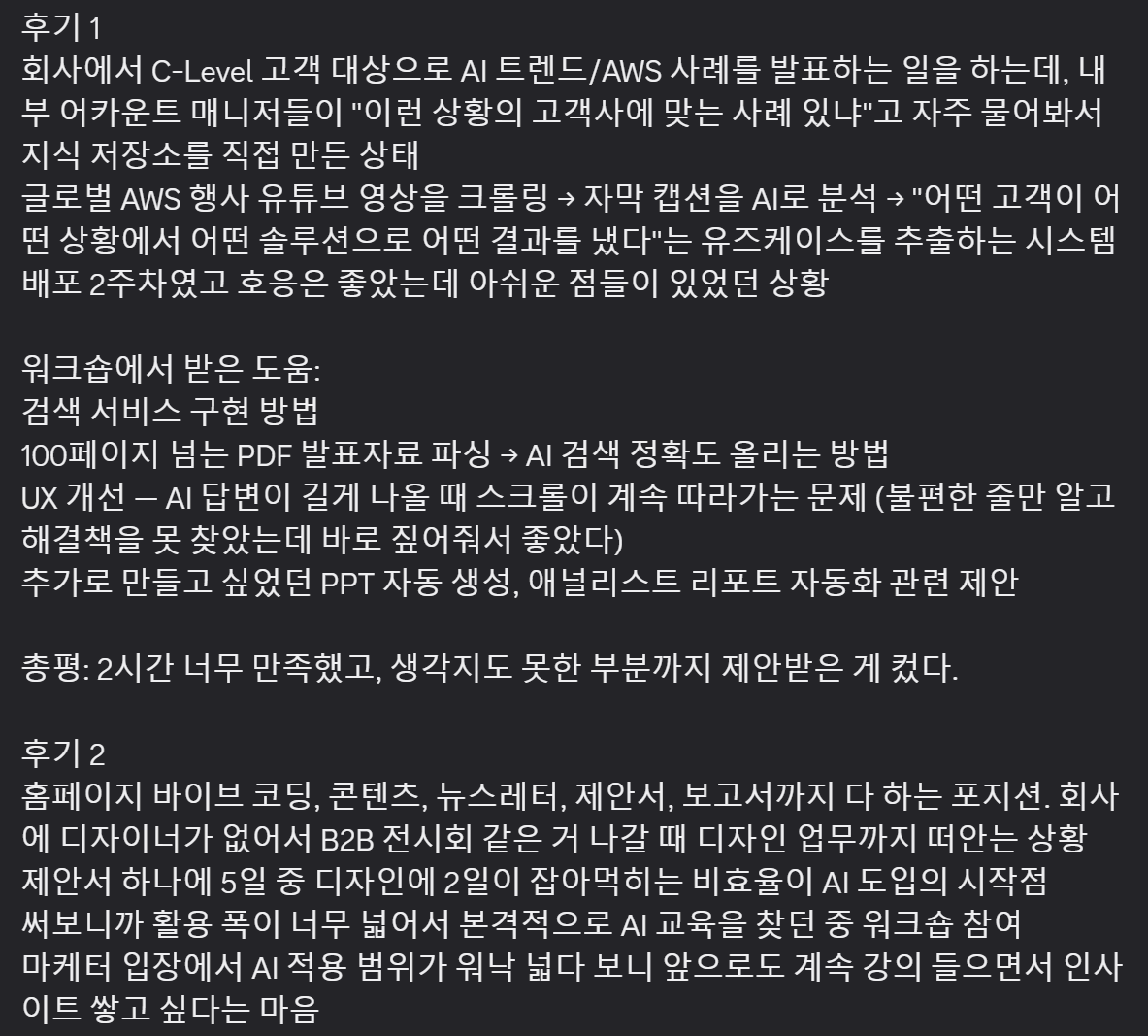 또한, 클라이원트는 웨비나 참여자 대상 실제 클로드 코드 오프라인 워크샵을 진행 했고, 좋은 후기를 받았습니다. 물론 각 인원들의 실력에는 일부 편차가 존재했지만 각 인원별 맞춤화 된 가이드로 실제 고민하는 포인트를 해결해 드렸습니다.